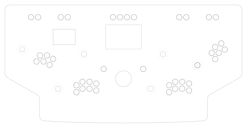 The final design above shows light gray lines where button caps, joystick dust covers, etc. cover holes, which are indicated by black shapes.